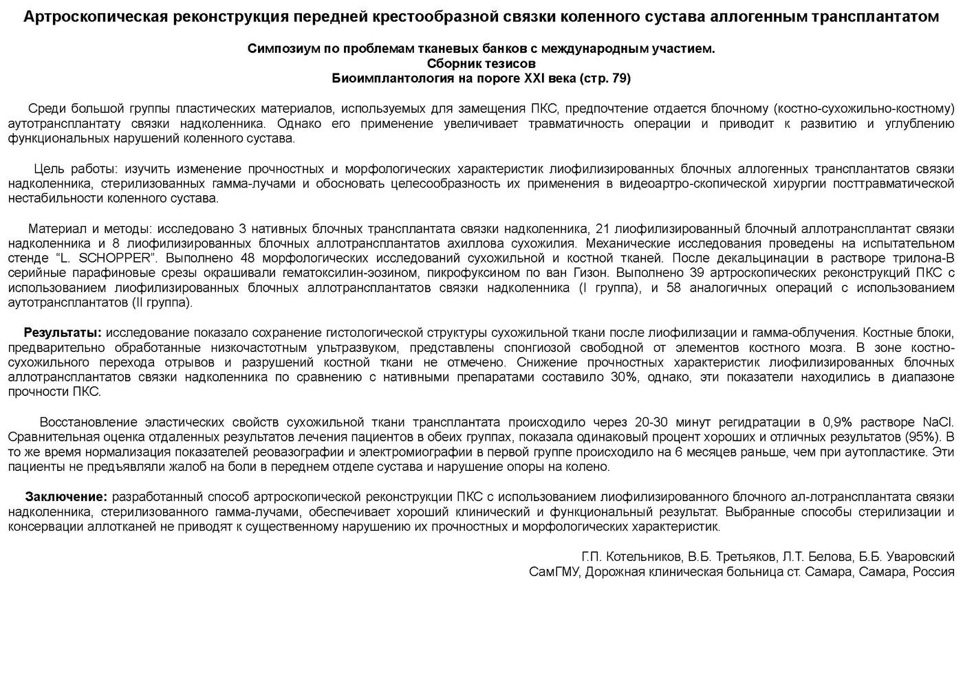 Заключение: разработанный способ артроскопической реконструкции ПКС с использованием лиофилизированного блочного ал-лотрансплантата связки надколенника, стерилизованного гамма-лучами, обеспечивает хороший клинический и функциональный результат.
