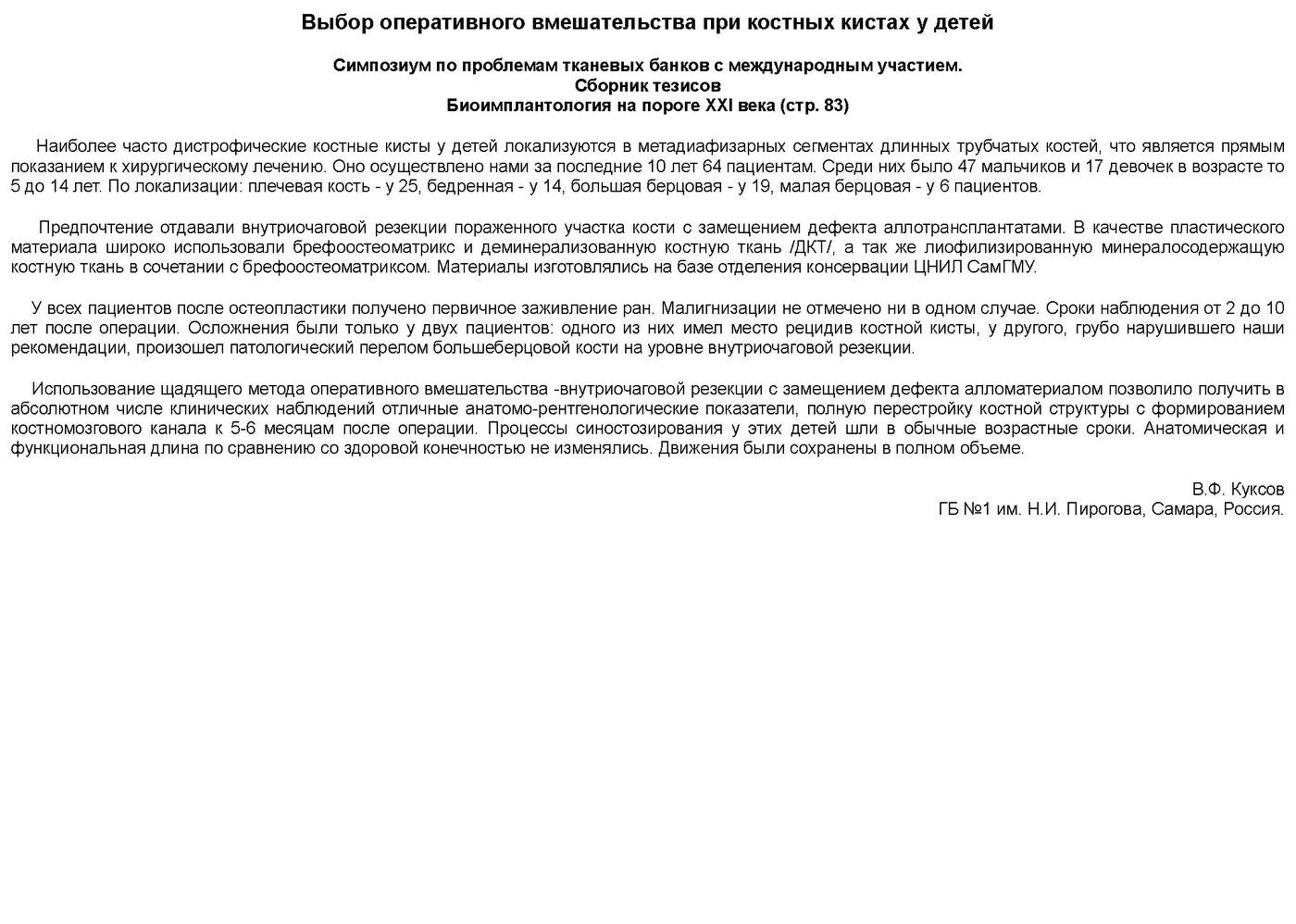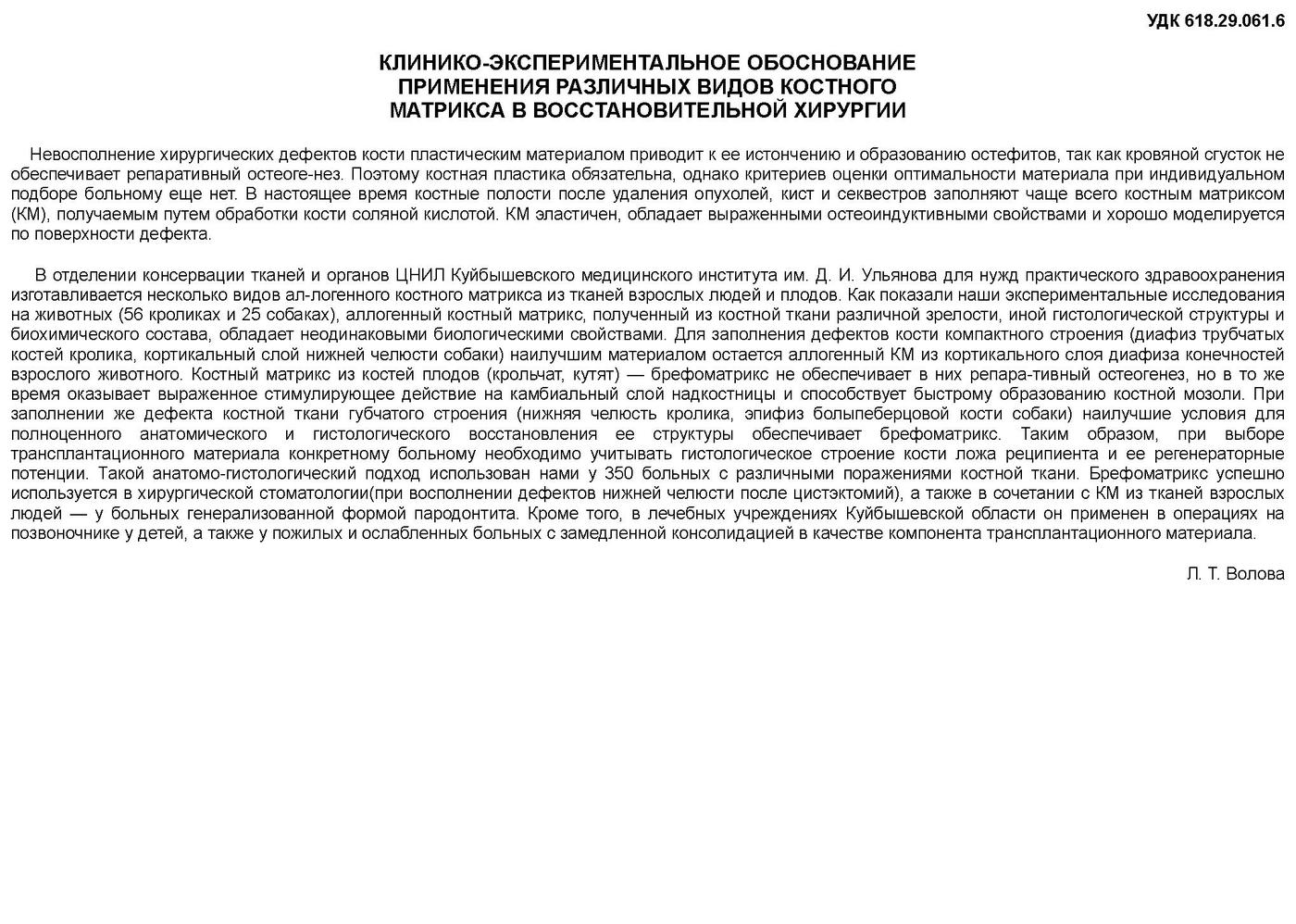 Кроме того, в лечебных учреждениях Куйбышевской области он применен в операциях на позвоночнике у детей, а также у пожилых и ослабленных больных с замедленной консолидацией в качестве компонента трансплантационного материала.