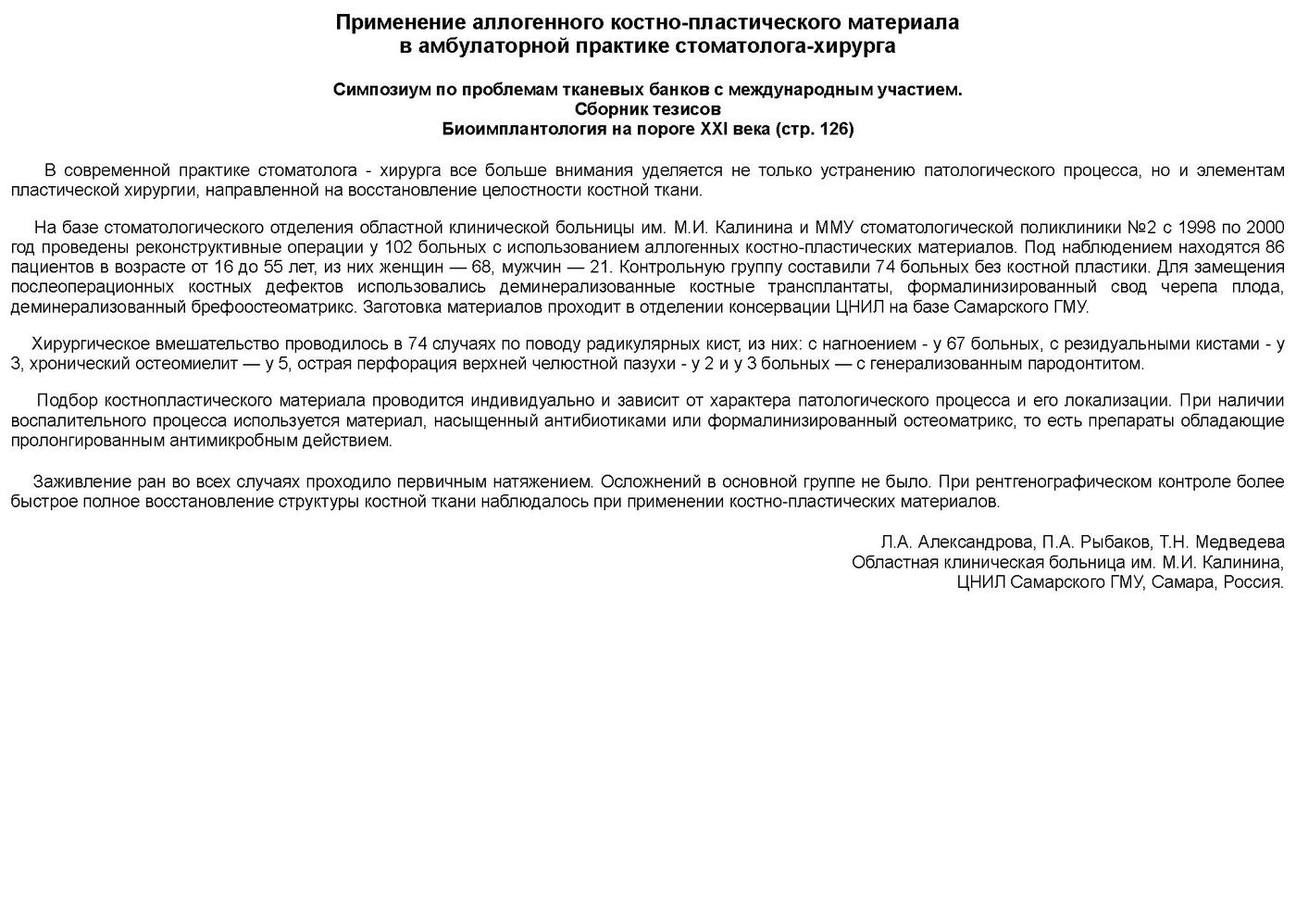 На базе стоматологического отделения областной клинической больницы им. М.И. Калинина и ММУ стоматологической поликлиники №2 с 1998 по 2000 год проведены реконструктивные операции у 102 больных с использованием аллогенных костно-пластических материалов.