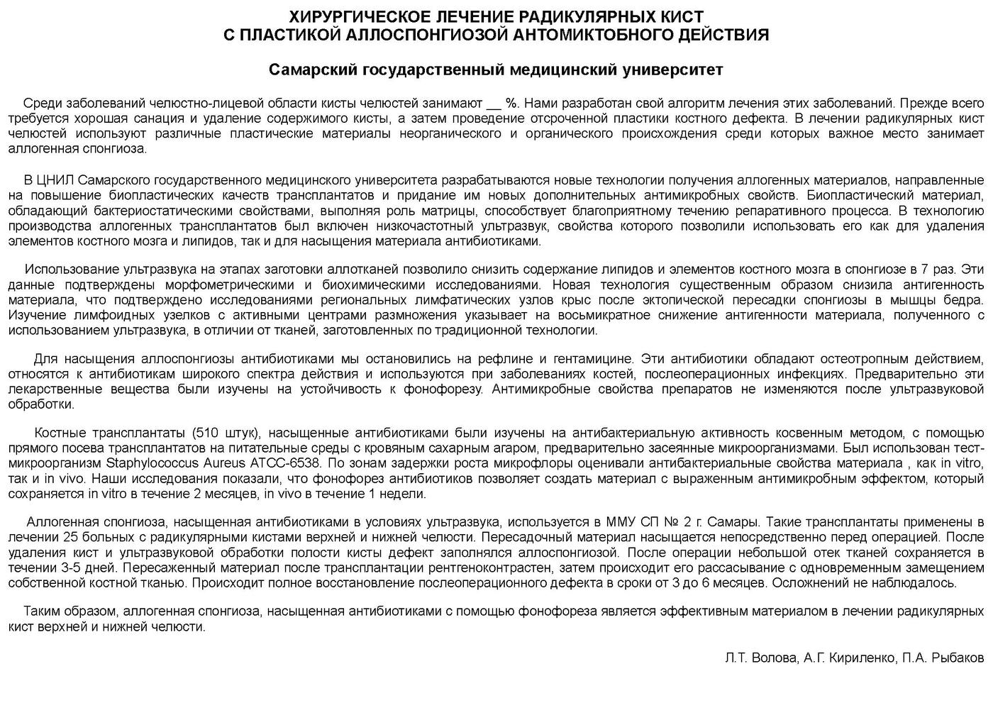 ХИРУРГИЧЕСКОЕ ЛЕЧЕНИЕ РАДИКУЛЯРНЫХ КИСТ С ПЛАСТИКОЙ АЛЛОСПОНГИОЗОЙ АНТОМИКТОБНОГО ДЕЙСТВИЯ