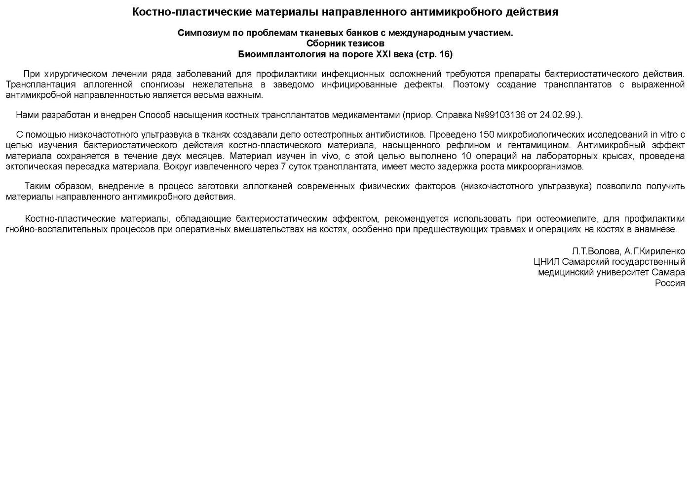 Нами разработан и внедрен Способ насыщения костных трансплантатов медикаментами (приор. Справка №99103136 от 24.02.99.).