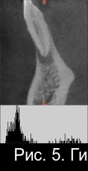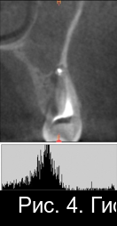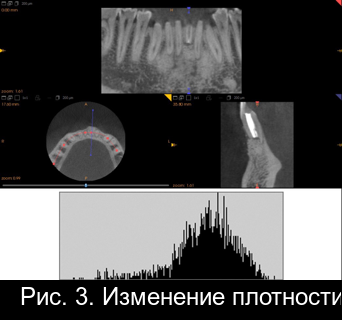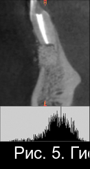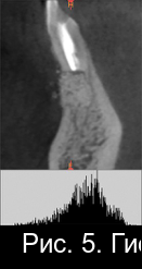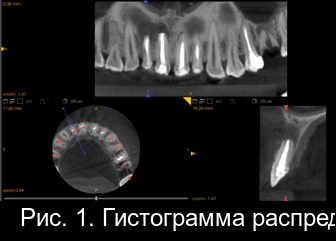 Рис. 2. Гистограмма распределения плотности на дентальной компьютерной томографии фронтального отдела нижней челюсти пациента М. непосредственно после операции РВК зуба 4.1 с заполнением костной полости материалом «CrossBone»®.