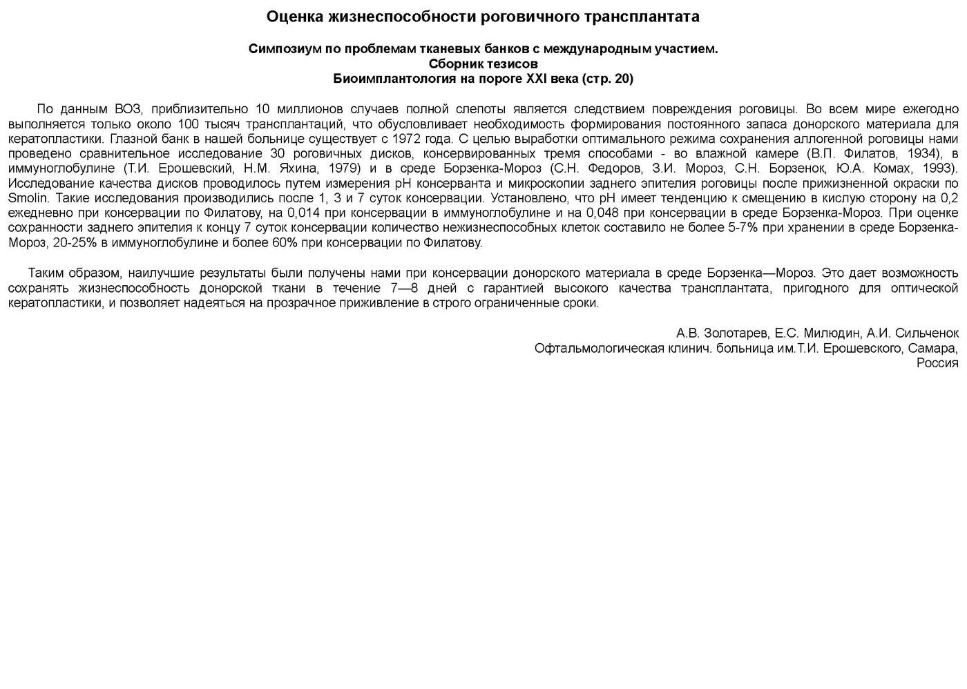 Таким образом, наилучшие результаты были получены нами при консервации донорского материала в среде Борзенка-Мороз.