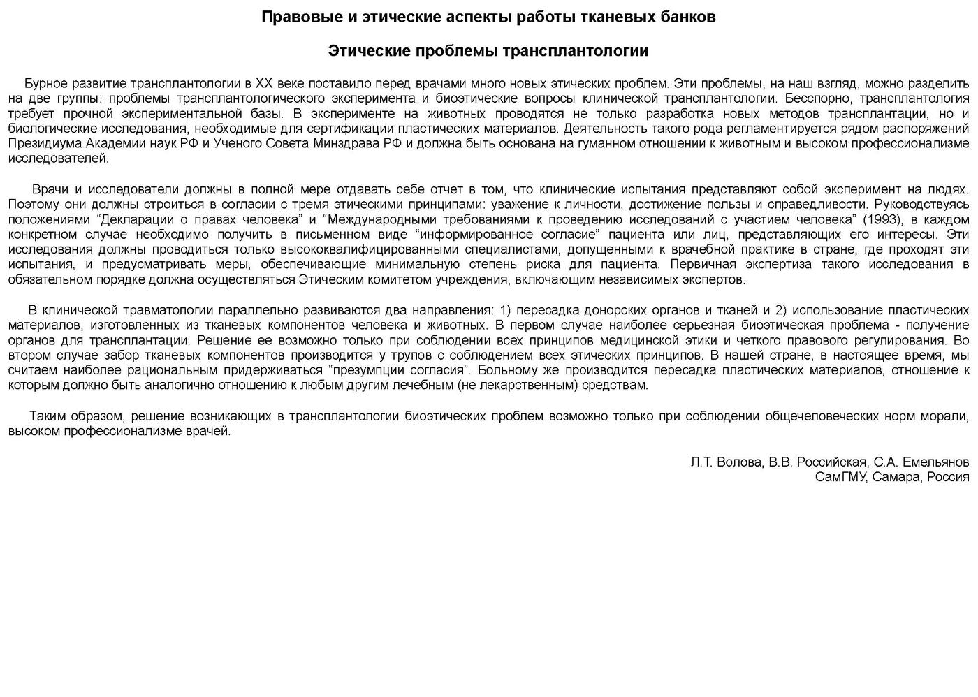 Эти проблемы, на наш взгляд, можно разделить на две группы: проблемы трансплантологического эксперимента и биоэтические вопросы клинической трансплантологии. Бесспорно, трансплантология требует прочной экспериментальной базы.