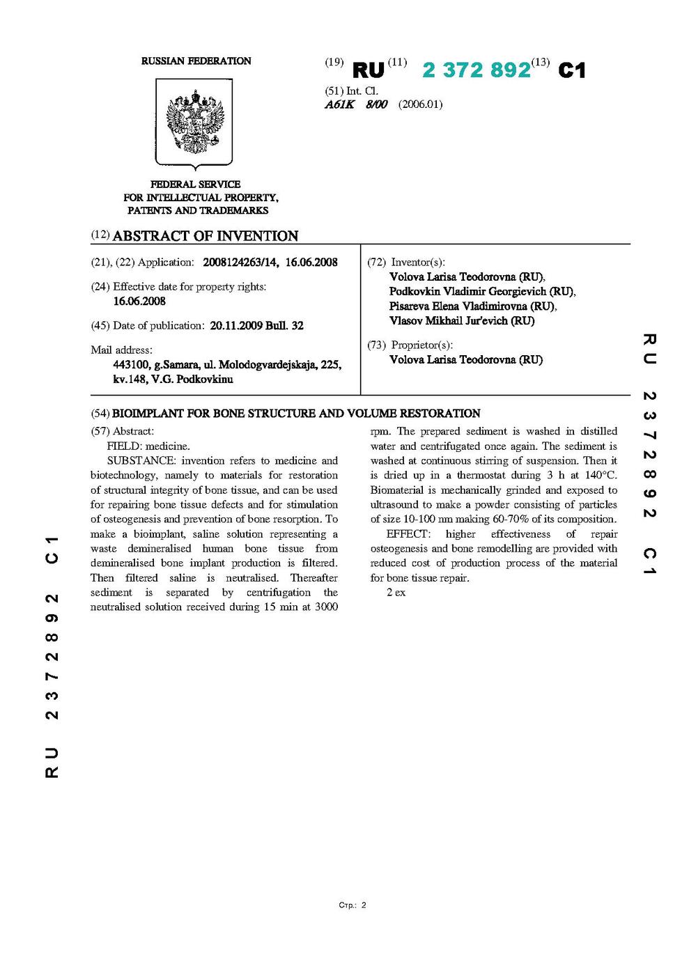 РОССИЙСКАЯ ФЕДЕРАЦИЯ ФЕДЕРАЛЬНАЯ СЛУЖБА ПО ИНТЕЛЛЕКТУАЛЬНОЙ СОБСТВЕННОСТИ, ПАТЕНТАМ И ТОВАРНЫМ ЗНАКАМ (51) МПК A61K 8/00 (2006.01) (19) RU(11) 2 372 892(13) C1