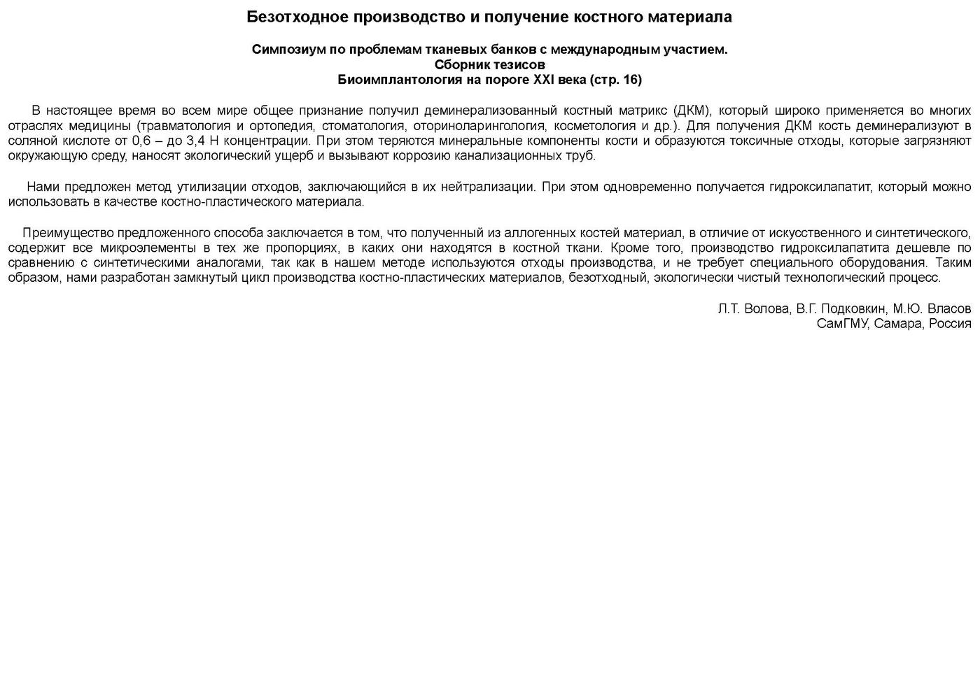 Таким образом, нами разработан замкнутый цикл производства костно-пластических материалов, безотходный, экологически чистый технологический процесс.