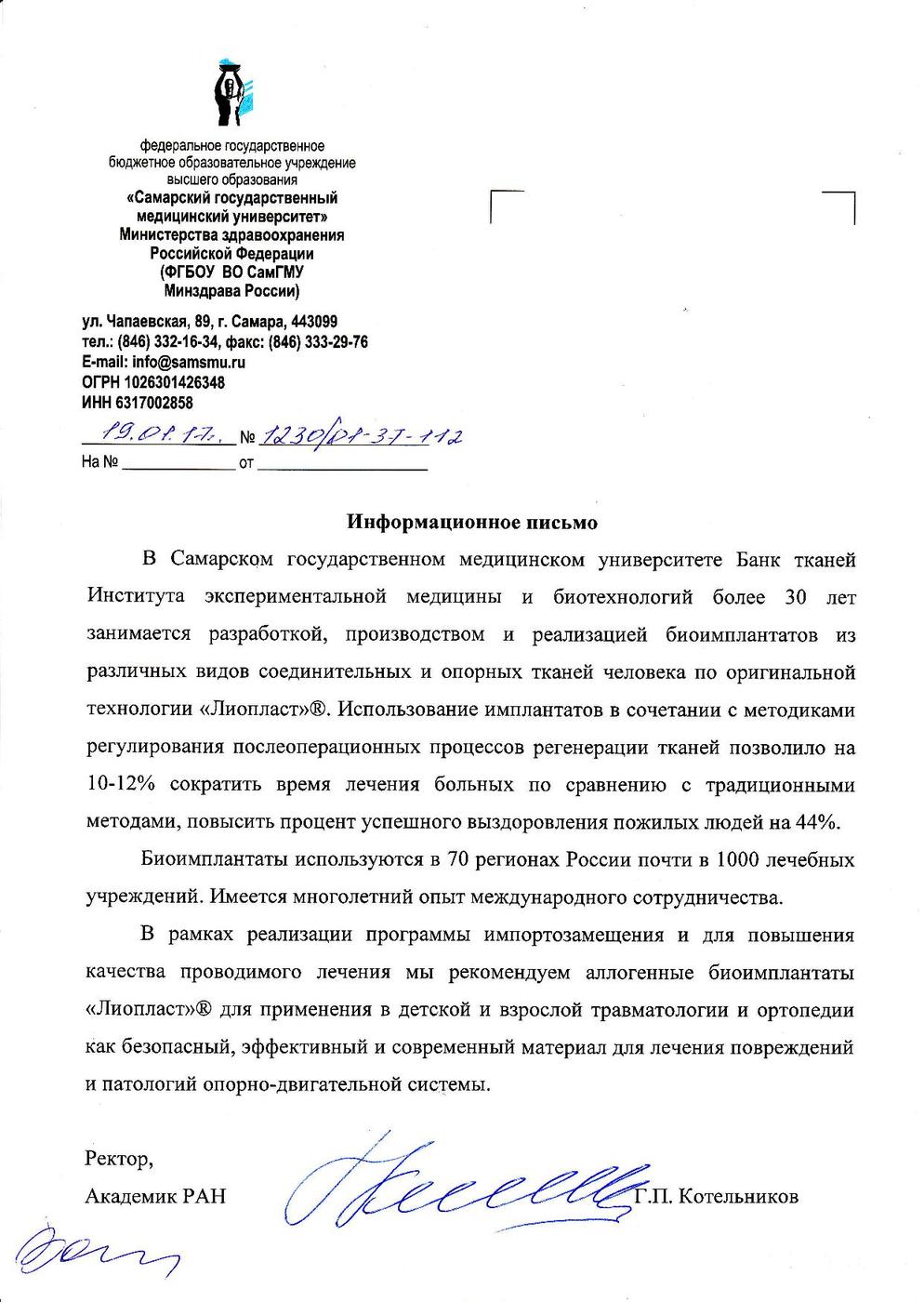 Информационное письмо ректора СамГМУ Котельникова Г.П.