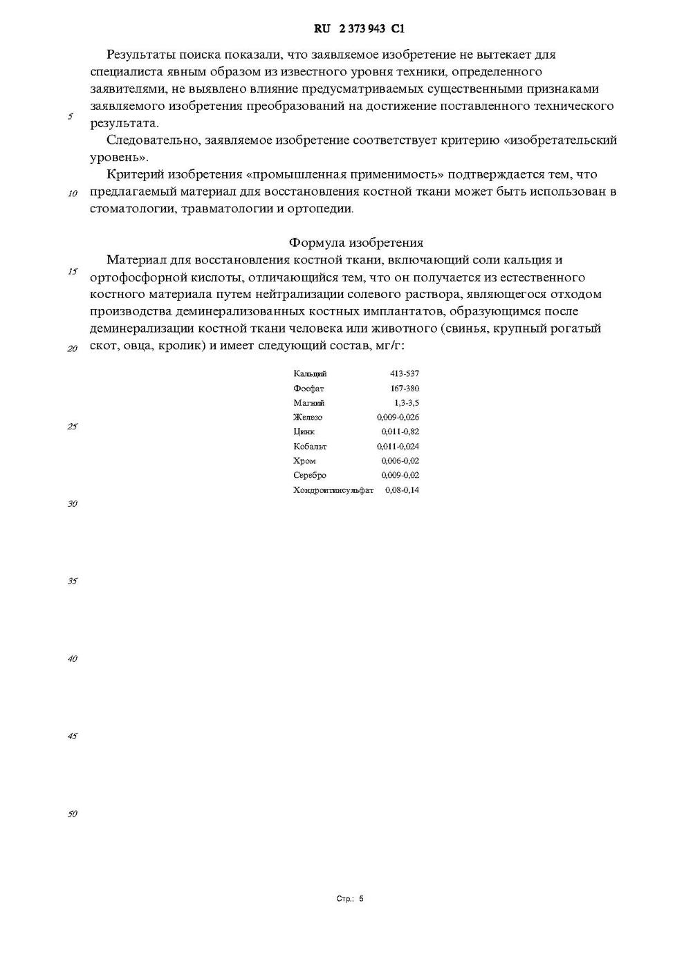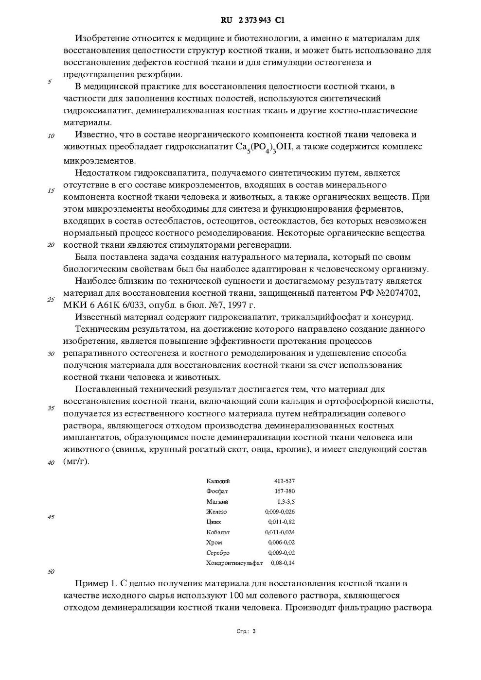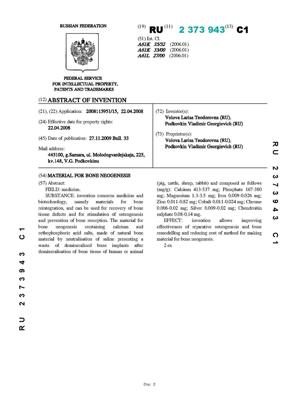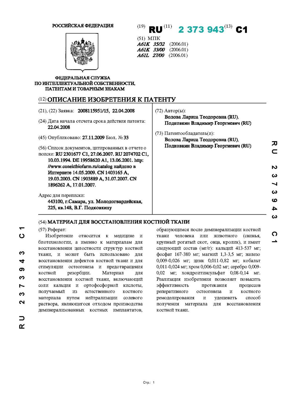 РОССИЙСКАЯ ФЕДЕРАЦИЯ ФЕДЕРАЛЬНАЯ СЛУЖБА ПО ИНТЕЛЛЕКТУАЛЬНОЙ СОБСТВЕННОСТИ, ПАТЕНТАМ И ТОВАРНЫМ ЗНАКАМ (51) МПК A61K 35/32 (2006.01) A61K 33/00 (2006.01) A61L 27/00 (2006.01) (19) RU(11) 2 373 943(13) C1 (12) ОПИСАНИЕ ИЗОБРЕТЕНИЯ К ПАТЕНТУ (21)