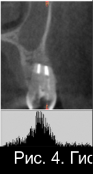 Рис. 2. Гистограмма распределения плотности на дентальной компьютерной томографии фронтального отдела нижней челюсти пациента М. непосредственно после операции РВК зуба 4.1 с заполнением костной полости материалом «CrossBone»®.
