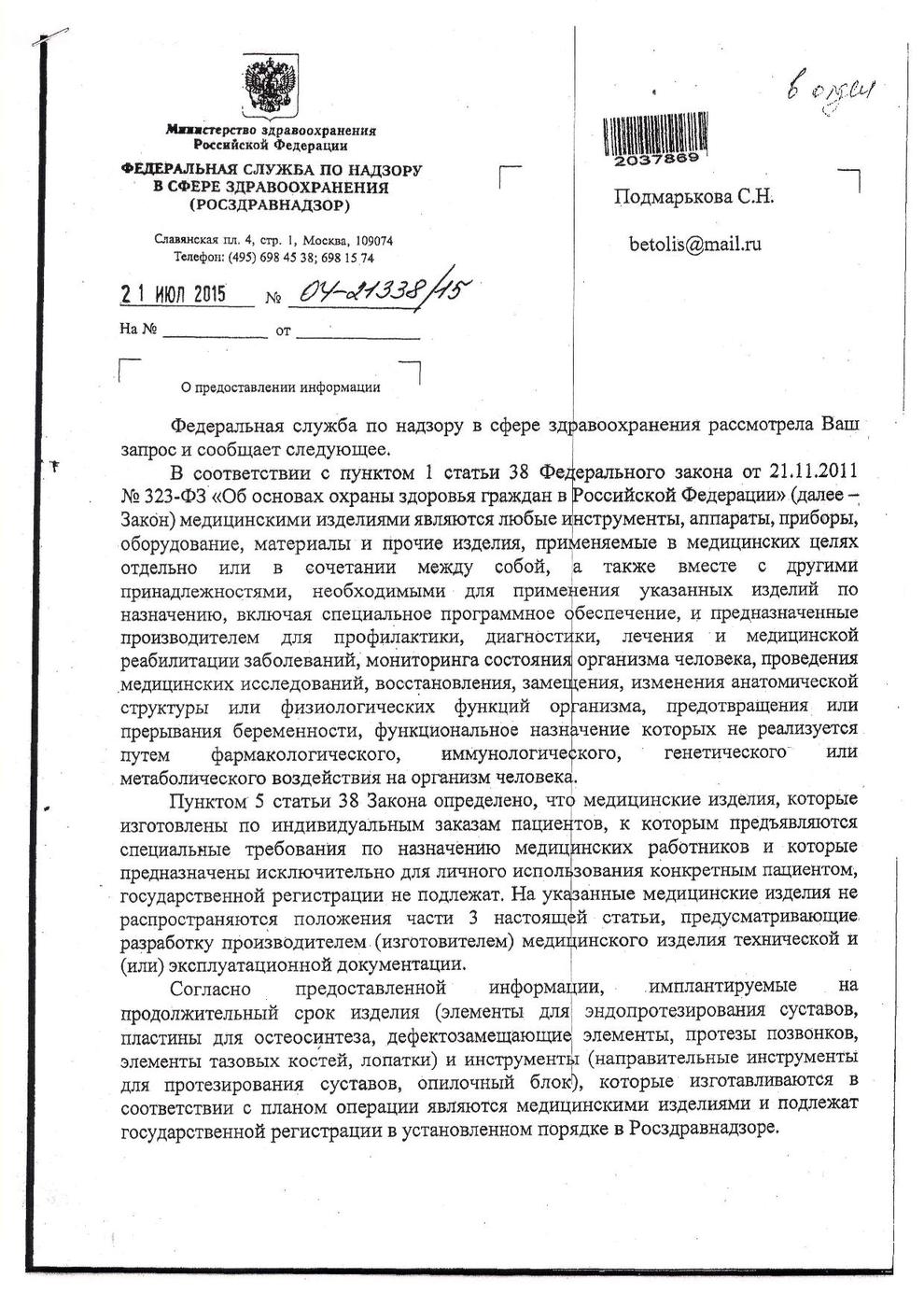 Письмо РосЗдравНадзора по поводу регистрации индивидуальных костных блоков.