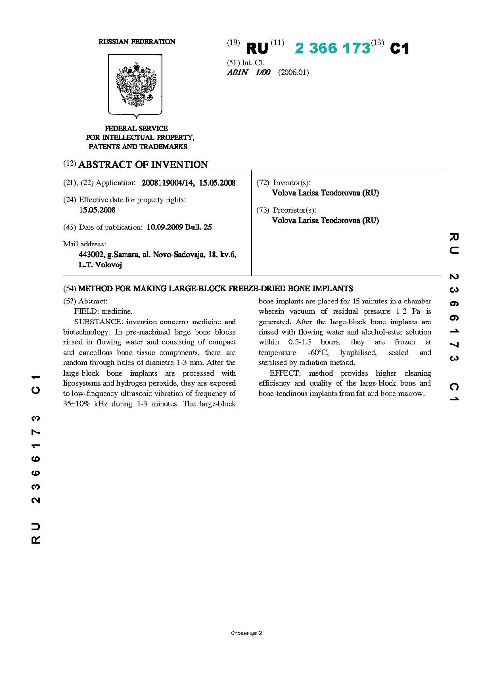 РОССИЙСКАЯ ФЕДЕРАЦИЯ ФЕДЕРАЛЬНАЯ СЛУЖБА ПО ИНТЕЛЛЕКТУАЛЬНОЙ СОБСТВЕННОСТИ, ПАТЕНТАМ И ТОВАРНЫМ ЗНАКАМ (51) МПК A01N 1/00 (2006.01) (19) RU (11) 2 366 173(13) C1 (12)