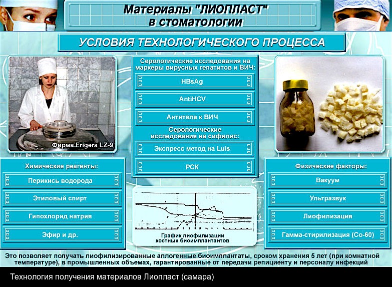 Технология производства биоимплантатов «ЛИОПЛАСТ» позволяют полностью защитить реципиента от передачи ему какого-либо заболевания, сводят до минимума опасность инфицирования персонала и делают процесс экологически безопасным и экономичным.