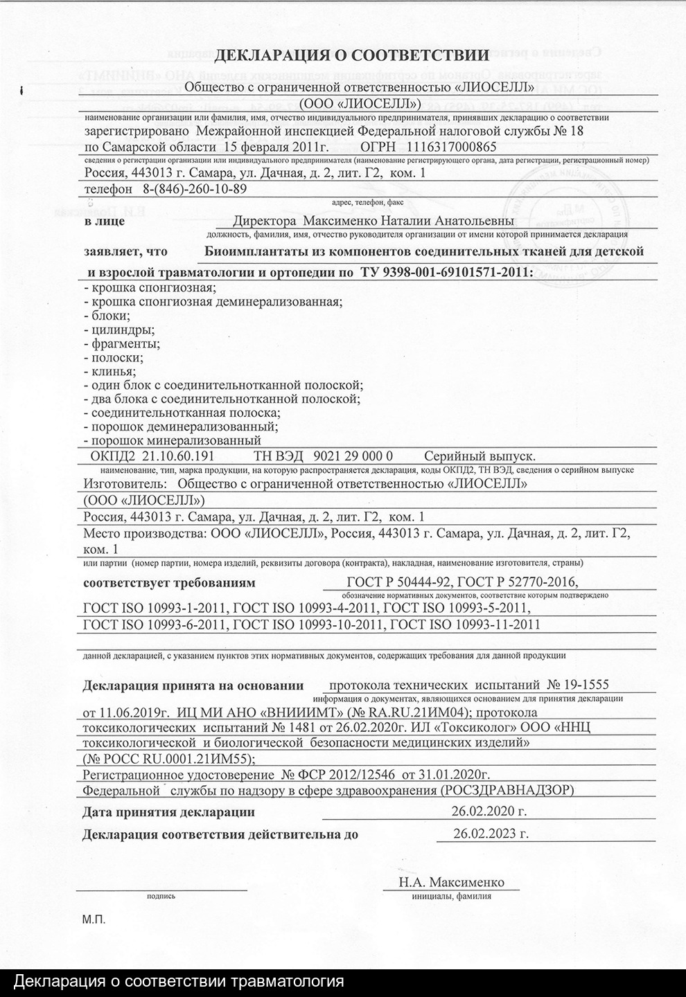 За время существования Самарского Банка Тканей все виды костно-замещающих материалов по технологии «Лиопласт» прошли клиническую апробацию во многих городах России и ЕЭС.