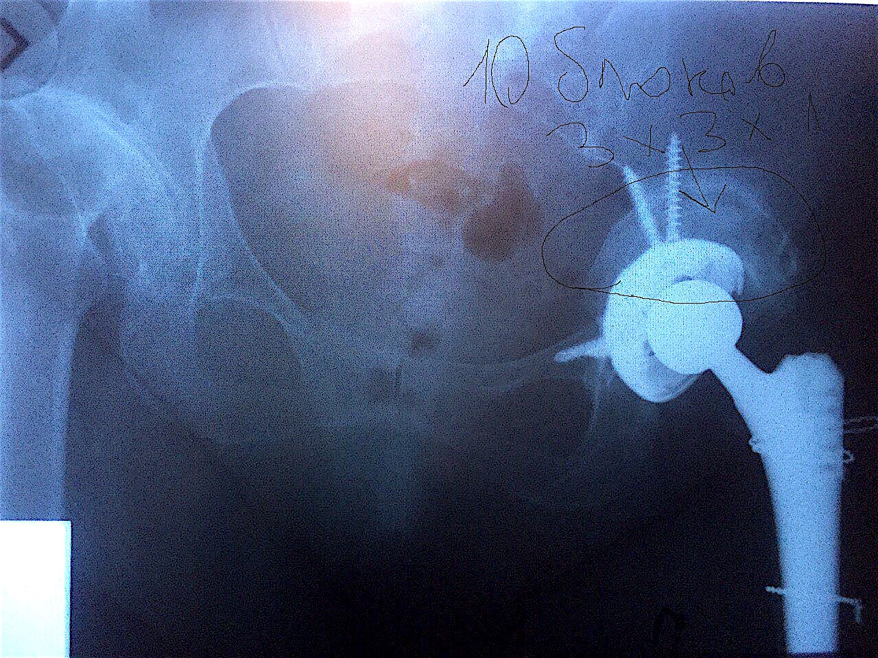 Сделано тотальное эндопротезирование левого тазобедренного сустава с компенсацией дефицита вертлужной впадины костным аллотрансплантатом «Лиопласт» (в количестве 10 шт. губчатых блоков 3х3х1 см).