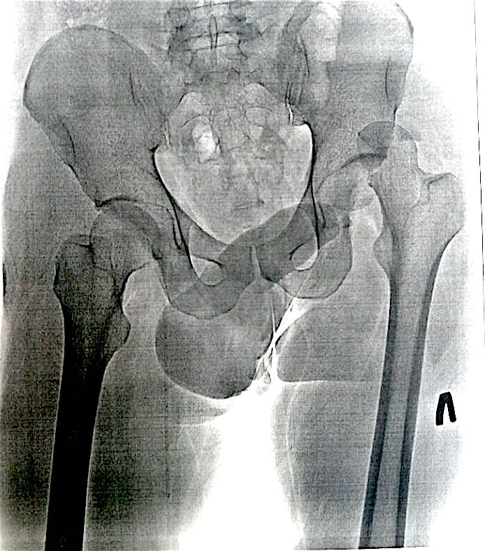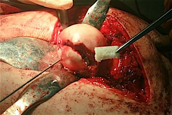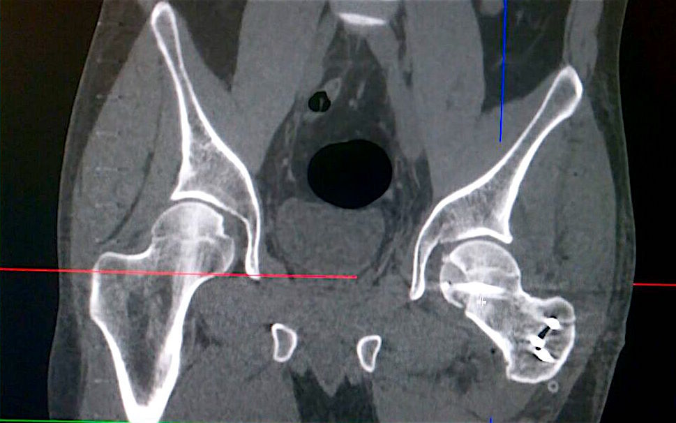 Травматический вывих левого бедра с переломом головки бедренной кости, произведено открытое вправление, репозиция перелома головки бедренной кости с применением костной аллопластики материалом «Лиопласт».